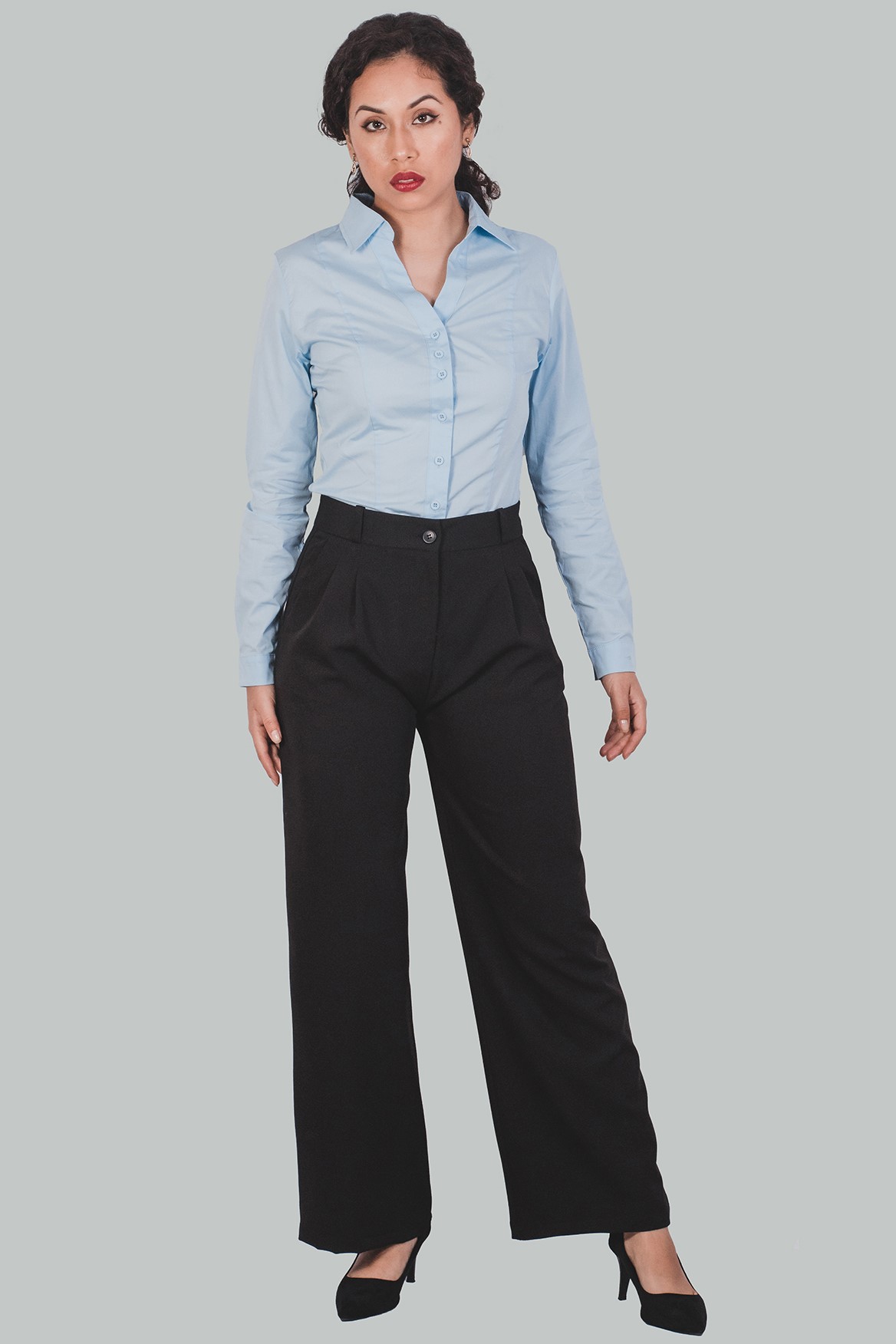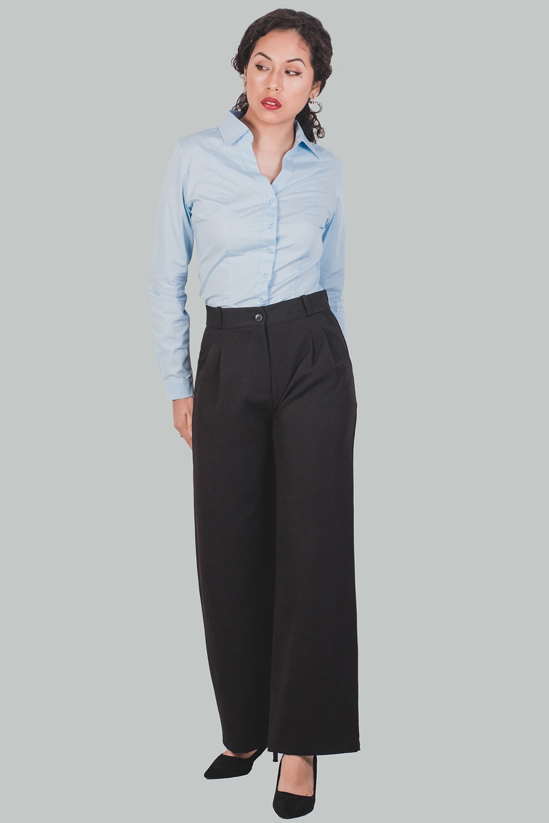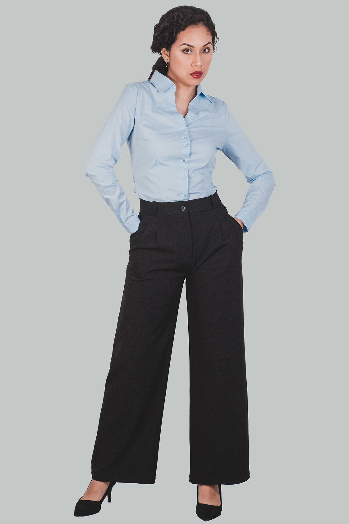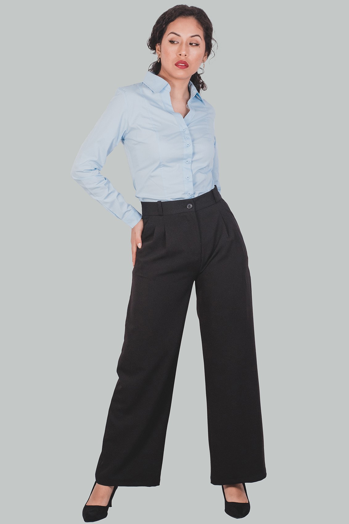 Pantalón Palazzo negro a la cintura Helena es un nuevo estilo elegante y formal; con cierre delantero, bolsillos inclinados en la parte delantera, falsos bolsillos en la posterior con pinzas, cremallera invisible, doble costura de seguridad. Un pantalón perfecto para trabajar, una reunión o evento cocktail.