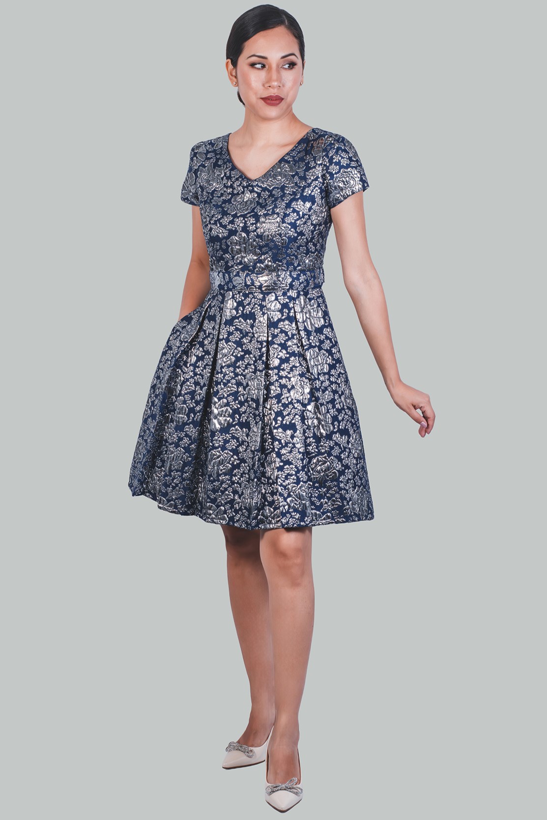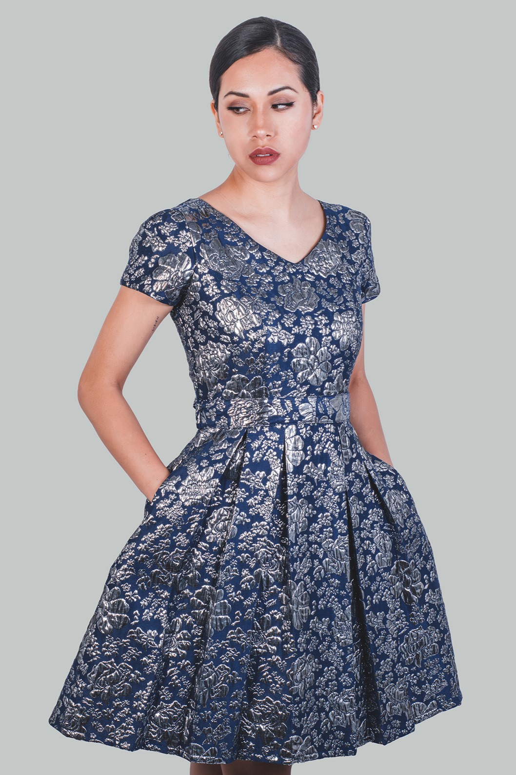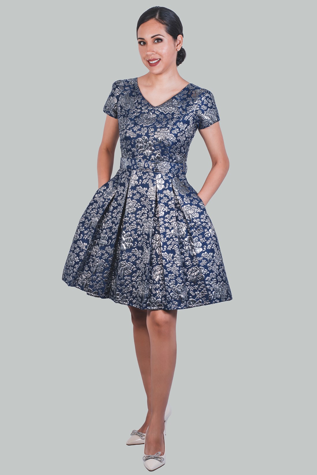 Vestido azul flores plateado Brigitte Gala a todos los tipos de cuerpo. Vestido con torso entallado, vestido acampanado formal debajo de la rodilla, elaborado en drill satinado 97% algodón y 3 % spandex. Elegante vestido satinado en manga corta con bolsillos.