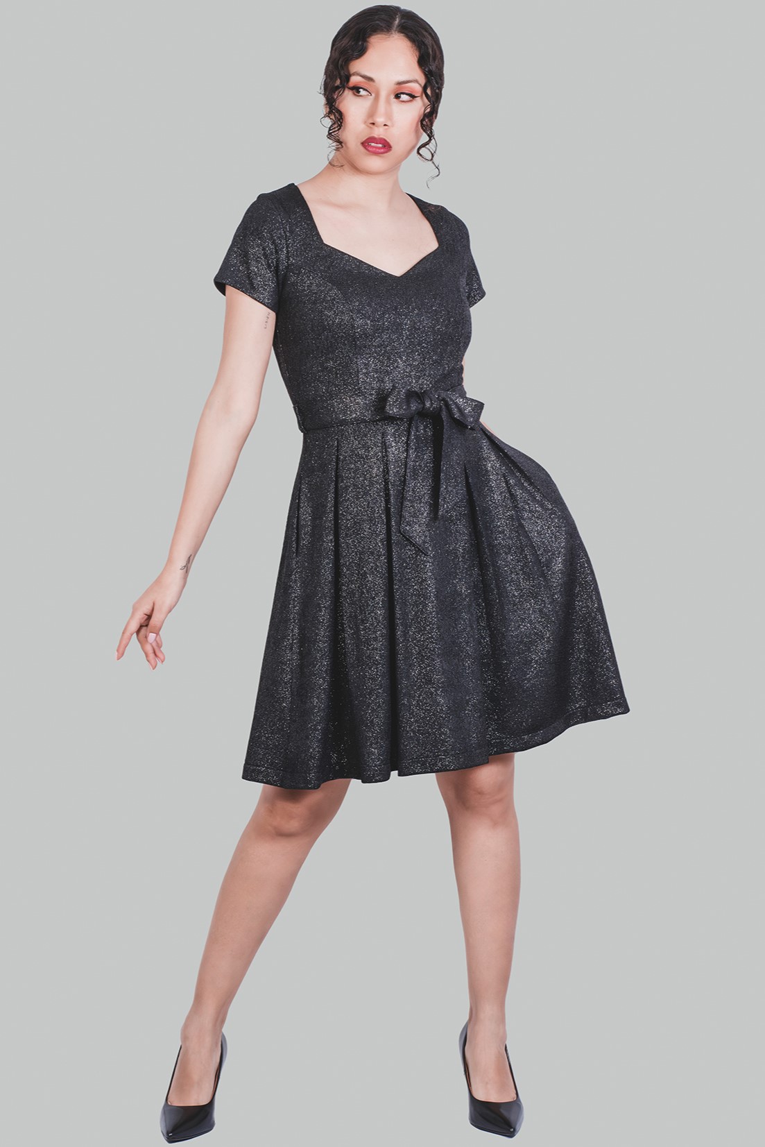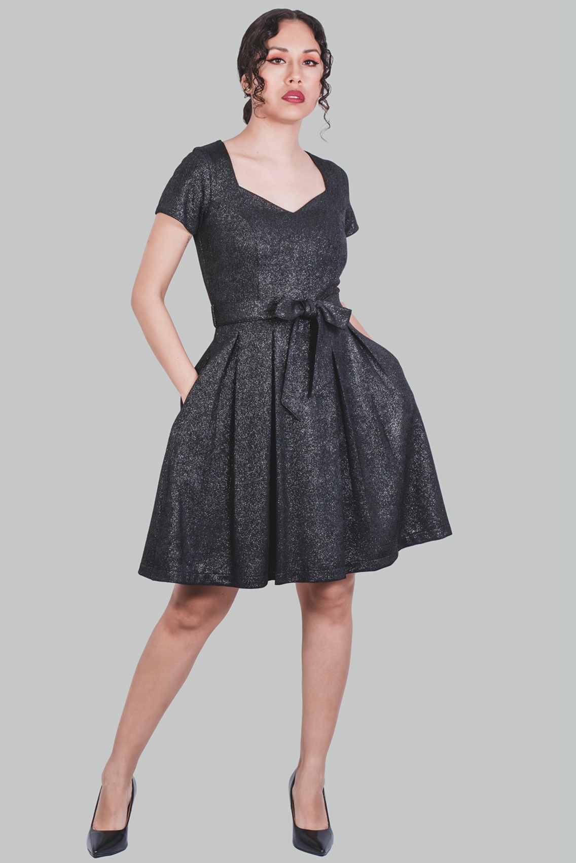 Vestido color negro con brillo Lucero favorece a todos los tipos de cuerpo.  Vestido con torso entallado, vestido acampanado formal hasta la rodilla, elaborado en tela satinado, forro completo. Elegante vestido en escote corazón en manga corta con bolsillos.