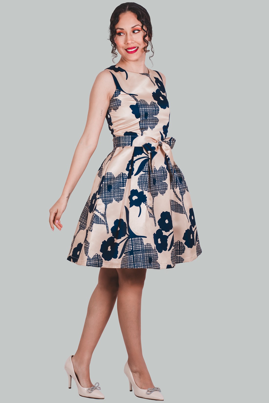 Vestido corte A dorado flores Anastasia es una versión del clásico vestido vintage de evento. Esta cargado de detalles considerados; cuello redondo, corte en la cintura, cierre invisible en la espalda, el lazo, bolsillos laterales, la falda con pliegues y la manga cero. Un vestido perfecto para trabajar, evento cocktail o con tacones y accesorios para la noche.