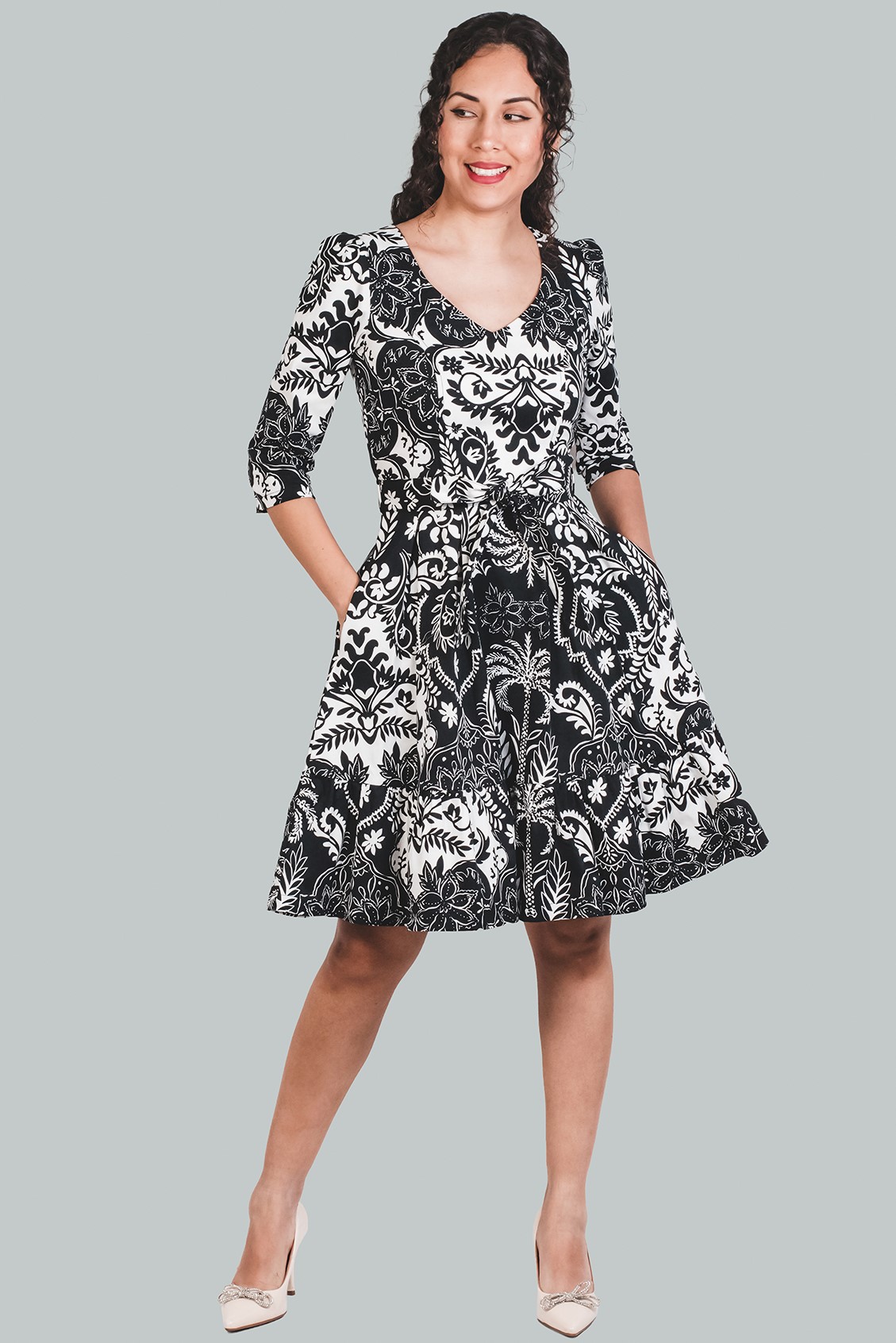 Vestido corte A negro flores Zuleika es una versión del clásico vestido vintage de evento. Esta cargado de detalles considerados; cuello v, corte en la cintura, cierre invisible en la espalda, el lazo, bolsillos laterales, la falda con pliegues y la manga corta. Un vestido perfecto para trabajar, evento cocktail o con tacones y accesorios para la noche.