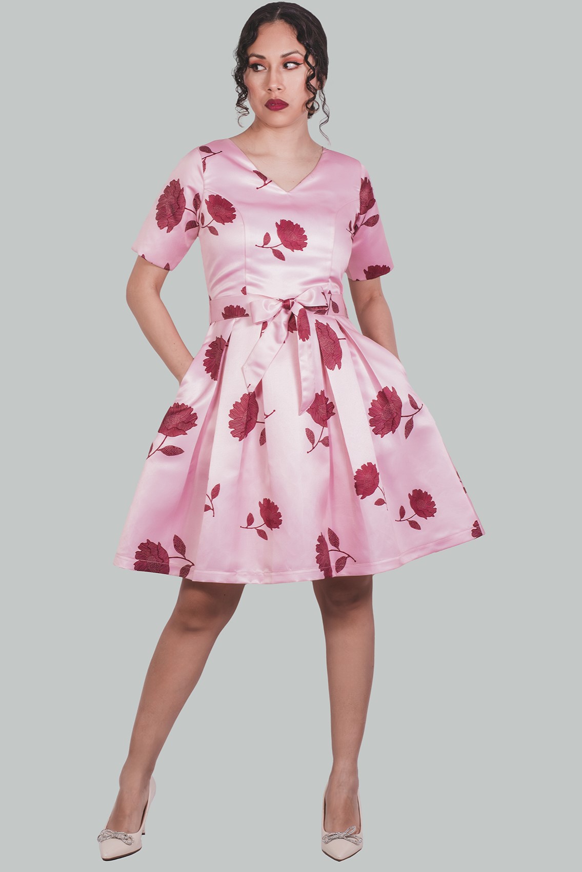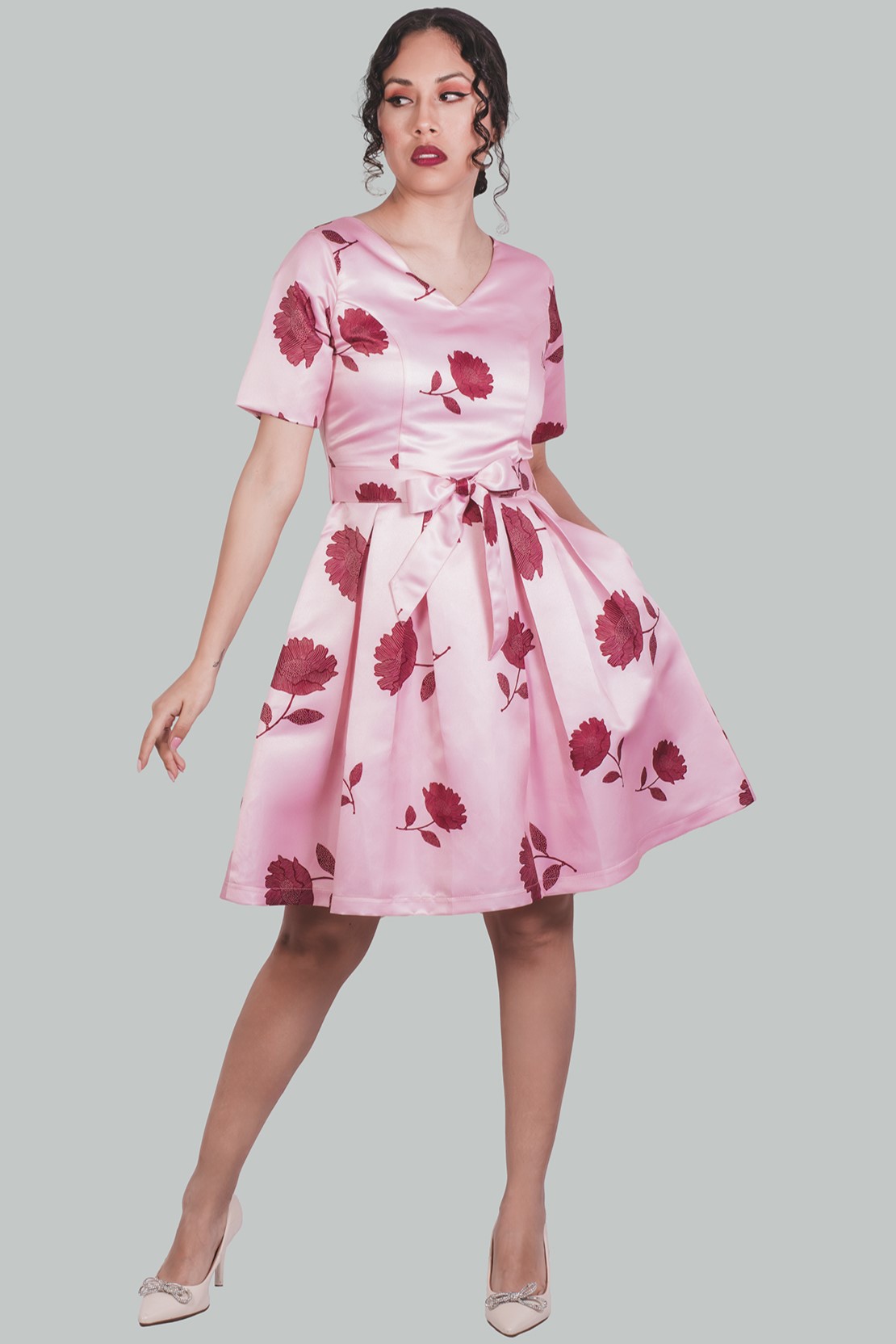 Vestido corte A rosa BB con flores Caeli es una versión del clásico vestido vintage de evento. Esta cargado de detalles considerados; cuello v, corte en la cintura, cierre invisible en la espalda, el lazo, bolsillos laterales, la falda con pliegues y la manga corta. Un vestido perfecto para trabajar, evento cocktail o con tacones y accesorios para la noche.