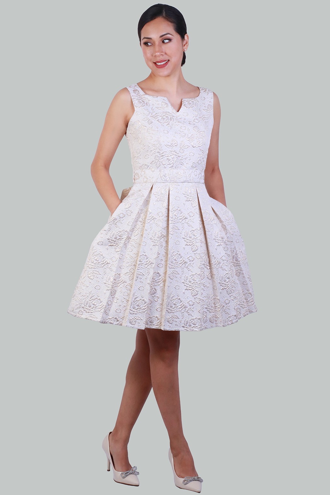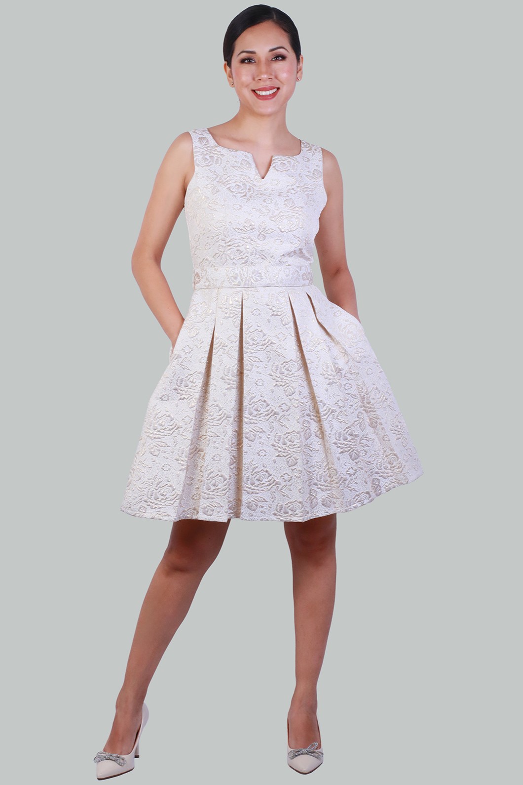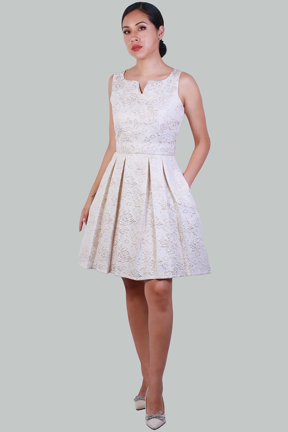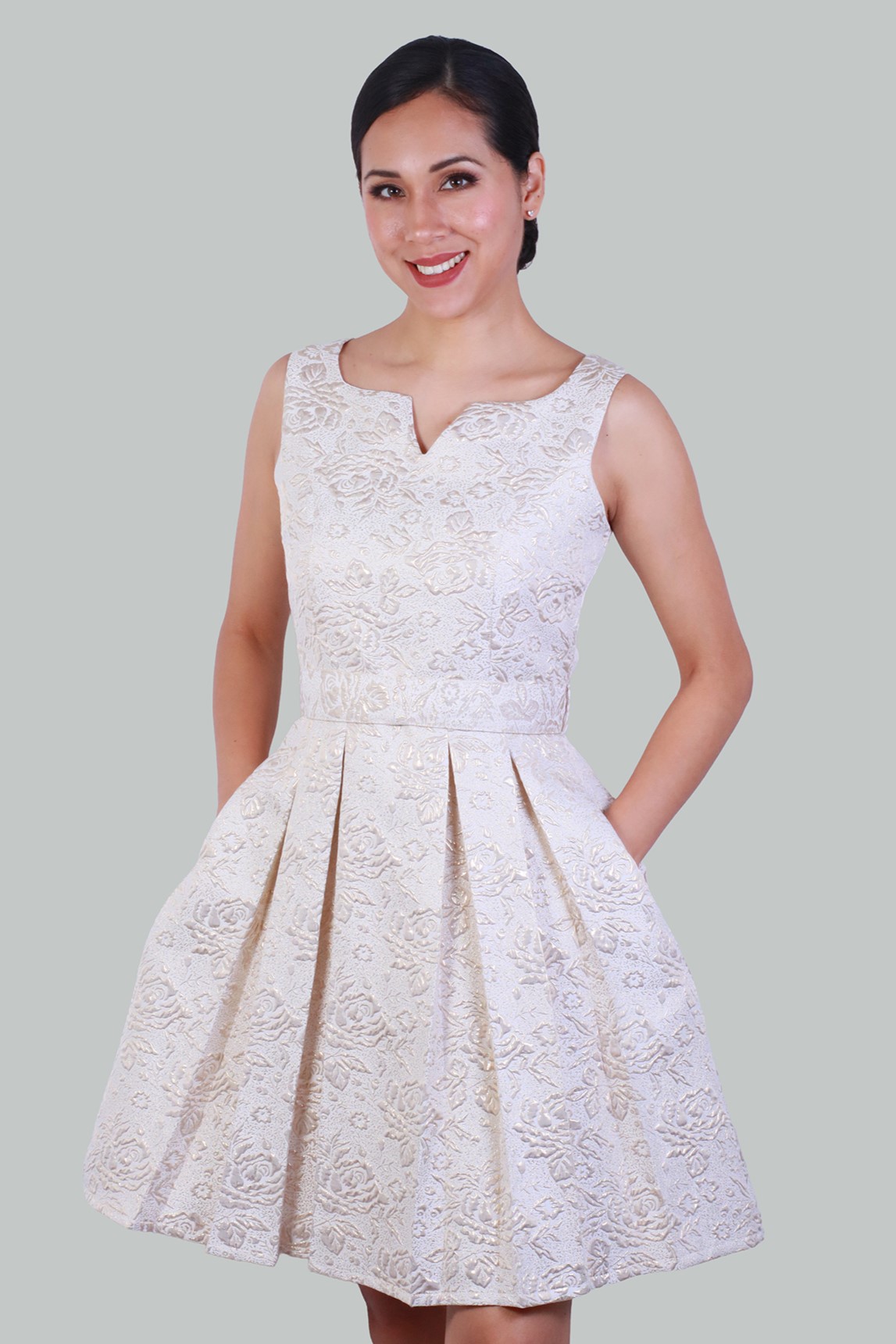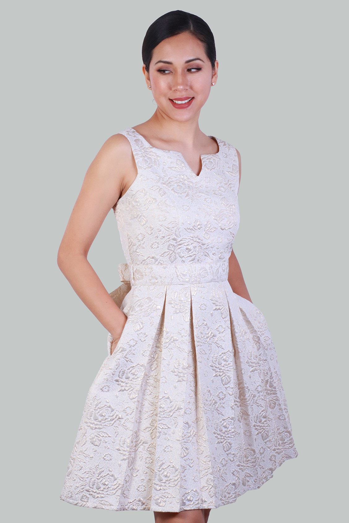 Compartir en:Vestido en A perla brocado Aria Gala es una versión del clásico vestido vintage de evento. Esta cargado de detalles considerados; cuello v, corte en la cintura, cierre invisible en la espalda, el lazo, bolsillos laterales, la falda con pliegues y la manga corta. Un vestido perfecto para trabajar, evento cocktail o con tacones y accesorios para la noche.
