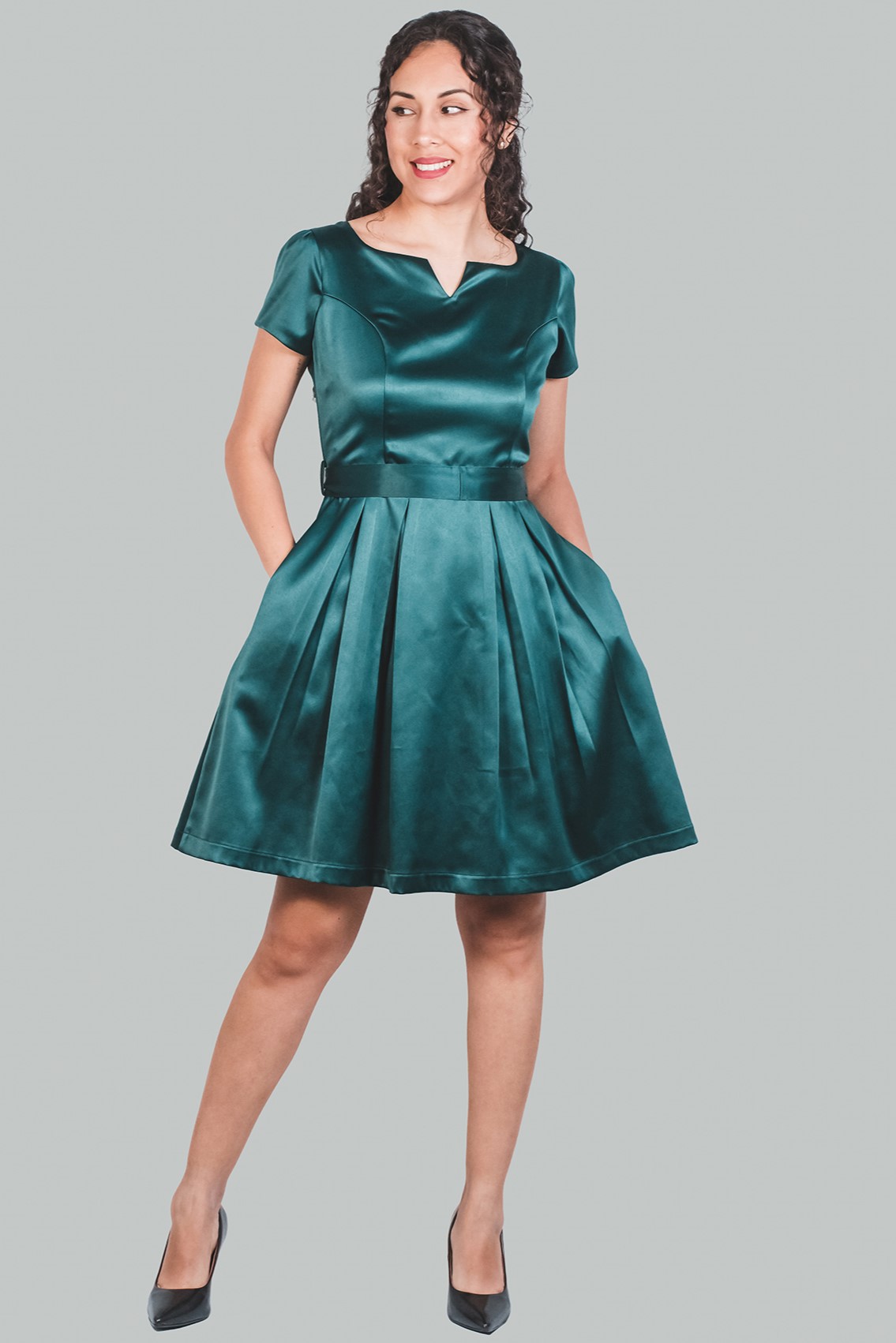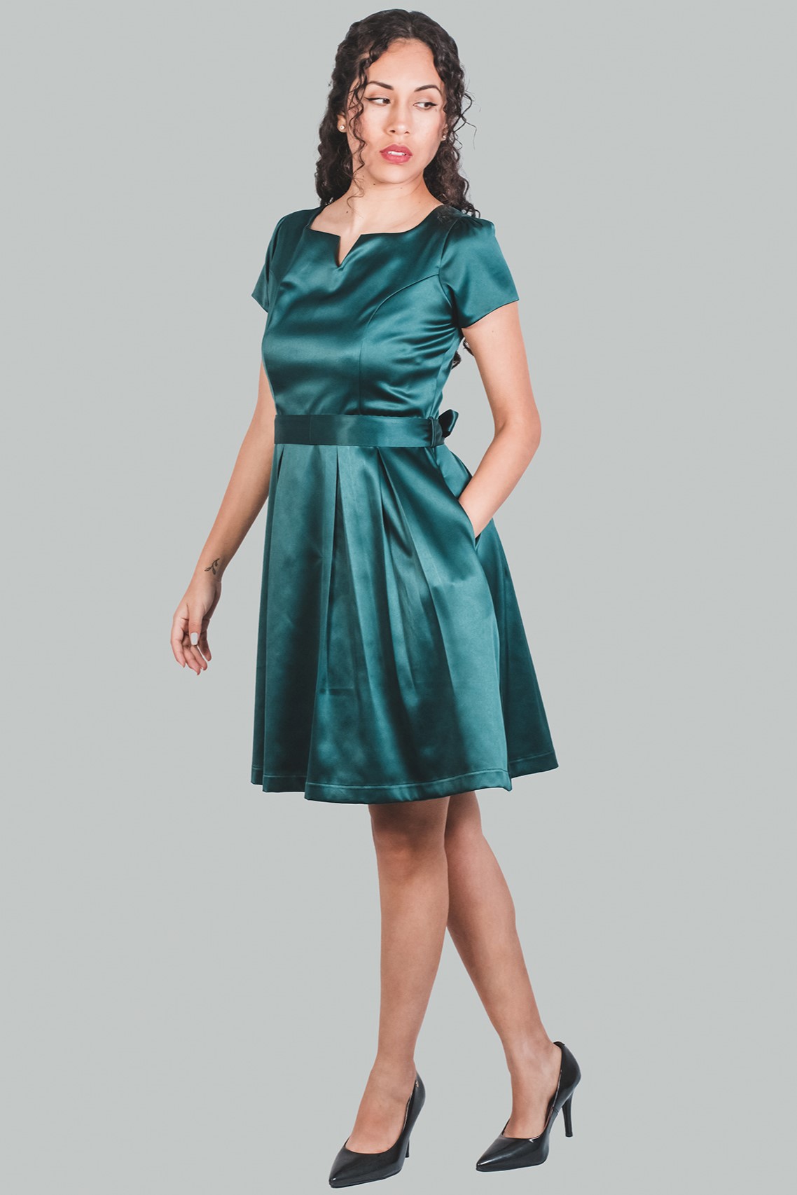 Vestido en A verde satinado Roberta es una versión del clásico vestido vintage de evento. Esta cargado de detalles considerados; cuello v, corte en la cintura, cierre invisible en la espalda, el lazo, bolsillos laterales, la falda con pliegues y la manga corta.  Un vestido perfecto para trabajar, evento cocktail o con tacones y accesorios para la noche.