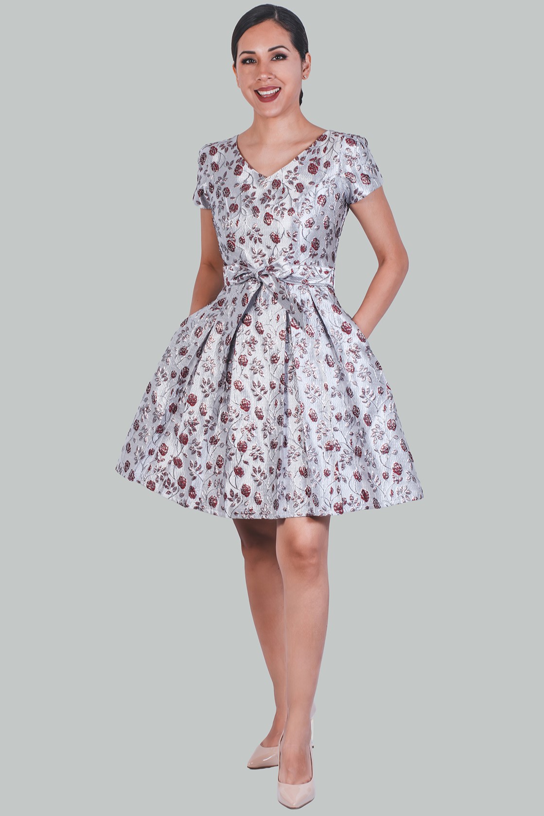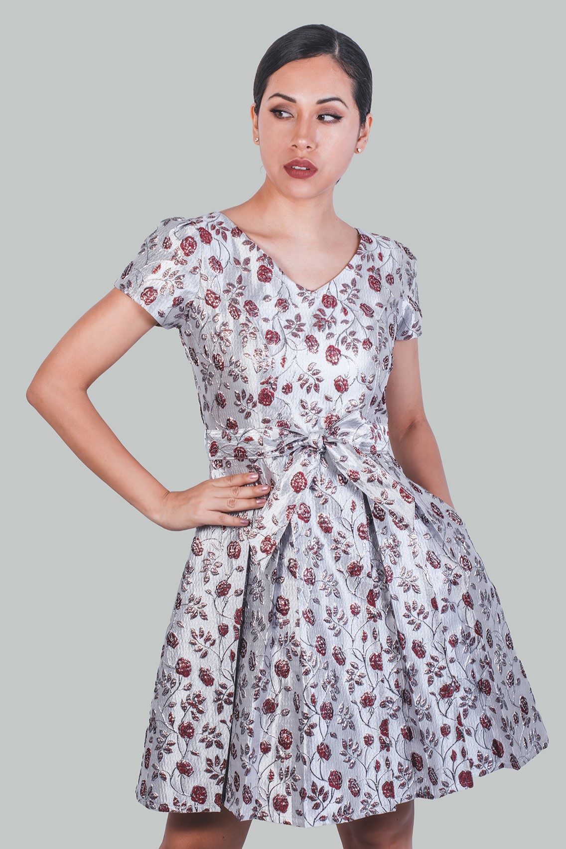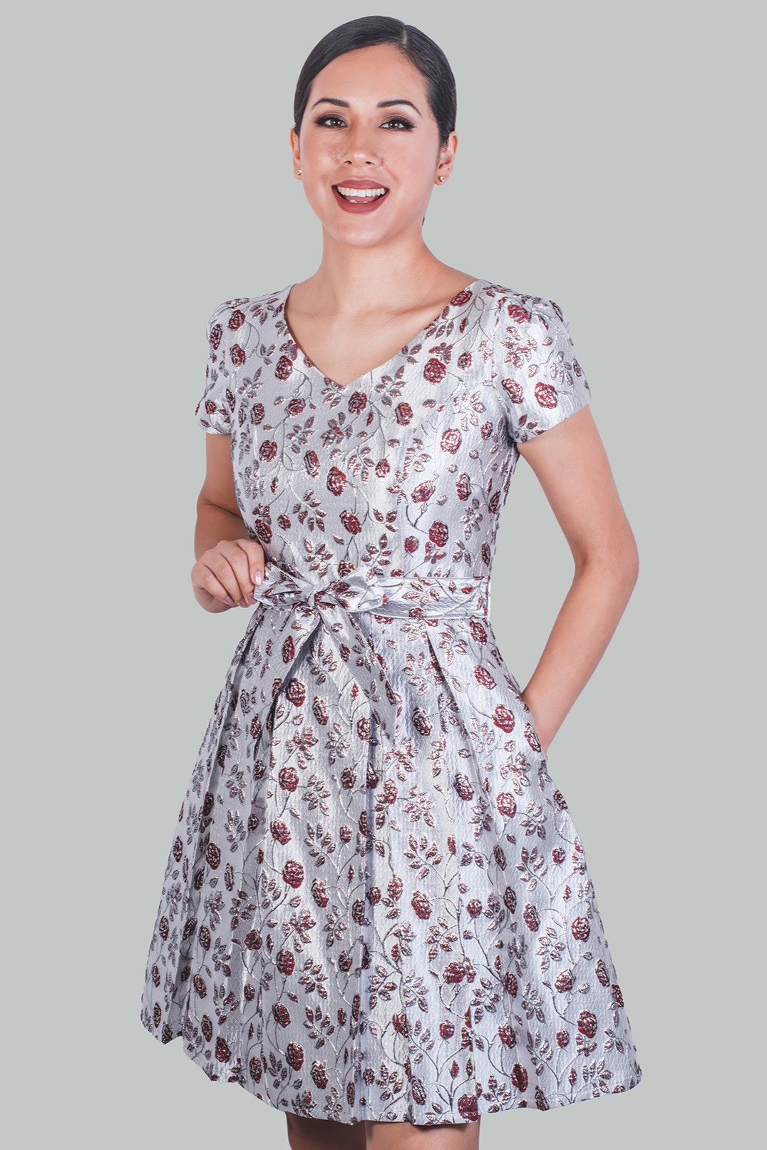 Vestido flores vino Brigitte Gala a todos los tipos de cuerpo. Vestido con torso entallado, vestido acampanado formal debajo de la rodilla, elaborado en drill satinado 97% algodón y 3 % spandex. Elegante vestido satinado en manga corta con bolsillos.