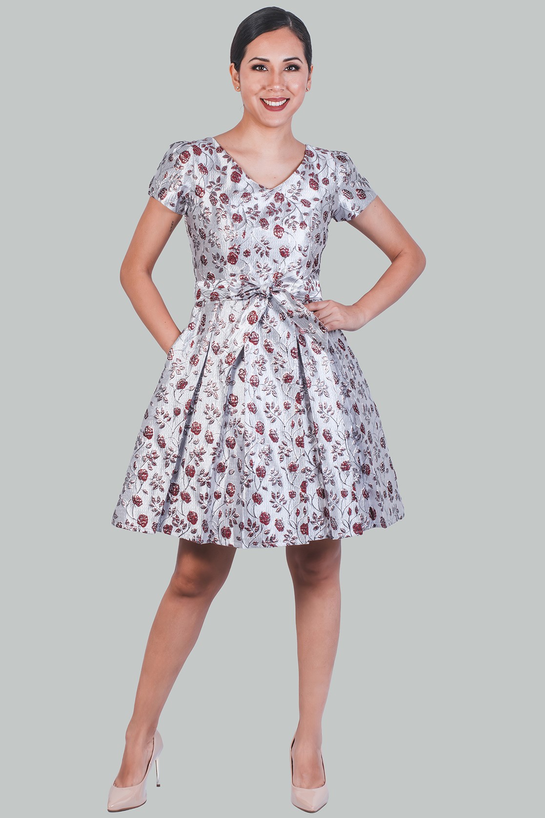 Compartir en:Vestido flores vino Brigitte Gala es una versión del clásico vestido vintage de evento. Esta cargado de detalles considerados; cuello v, corte en la cintura, cierre invisible en la espalda, el lazo, bolsillos laterales, la falda con pliegues y la manga corta. Un vestido perfecto para trabajar, evento cocktail o con tacones y accesorios para la noche.