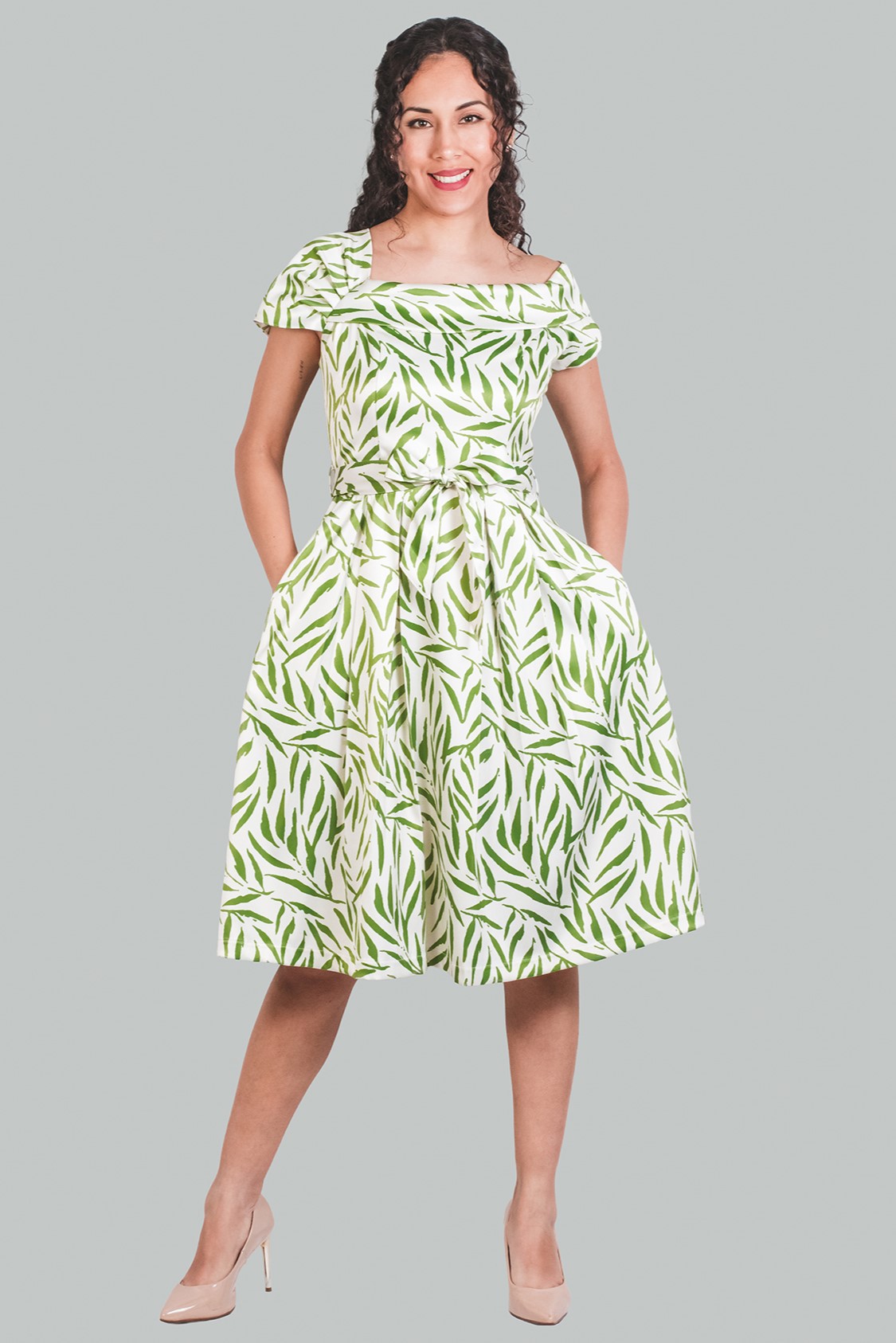Vestido midi asimétrico verde diseño Kaelis es una versión del clásico vestido vintage de evento. Esta cargado de detalles considerados tiene un escote asimétrico, manga derecha con recogido de pliegues, corte en la cintura, cierre invisible en la espalda, bolsillos laterales, la falda con pliegues y la manga medium. Un vestido perfecto para trabajar o evento cocktail. Con tacones y accesorios para la noche.