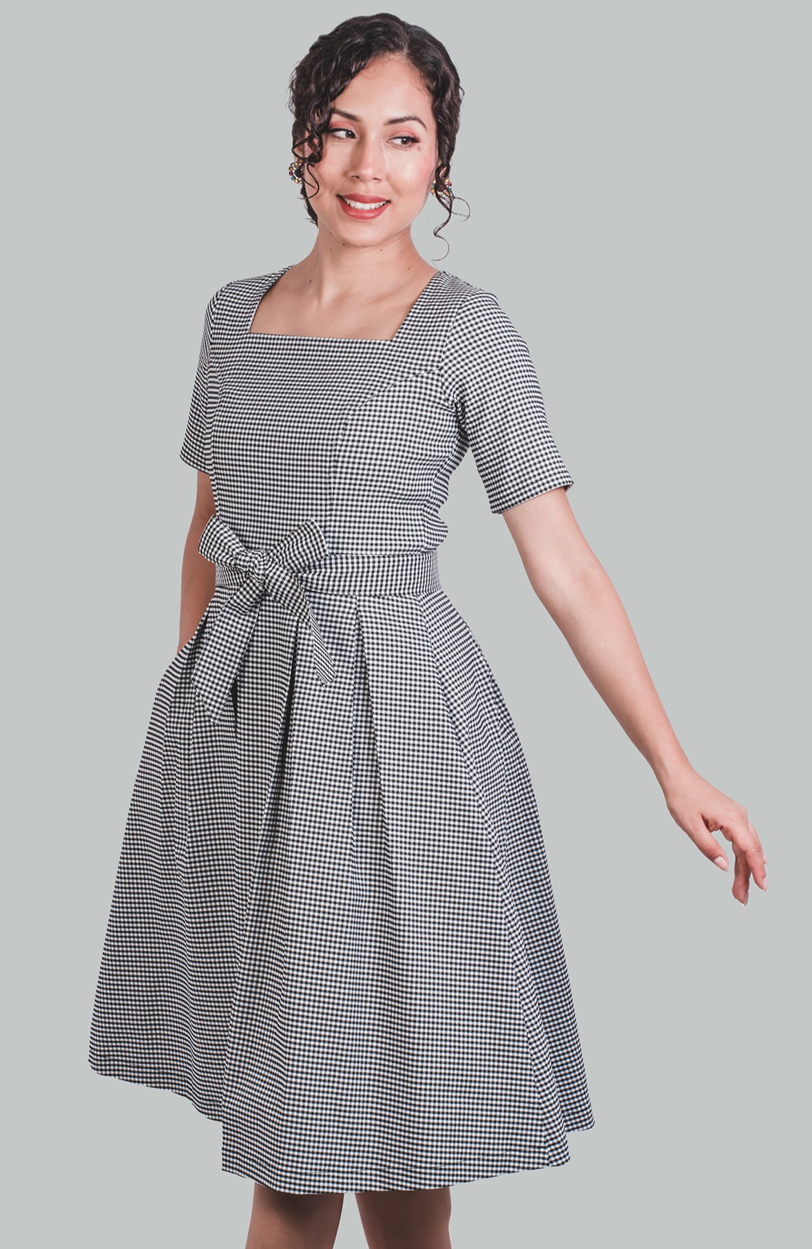 Vestido midi en A diseño cuadros Magdalena es una versión del clásico vestido vintage de evento. Esta cargado de detalles considerados; cuello v, corte en la cintura, cierre invisible en la espalda, el lazo, bolsillos laterales, la falda con pliegues y la manga corta. Un vestido perfecto para trabajar, evento cocktail o con tacones y accesorios para la noche.