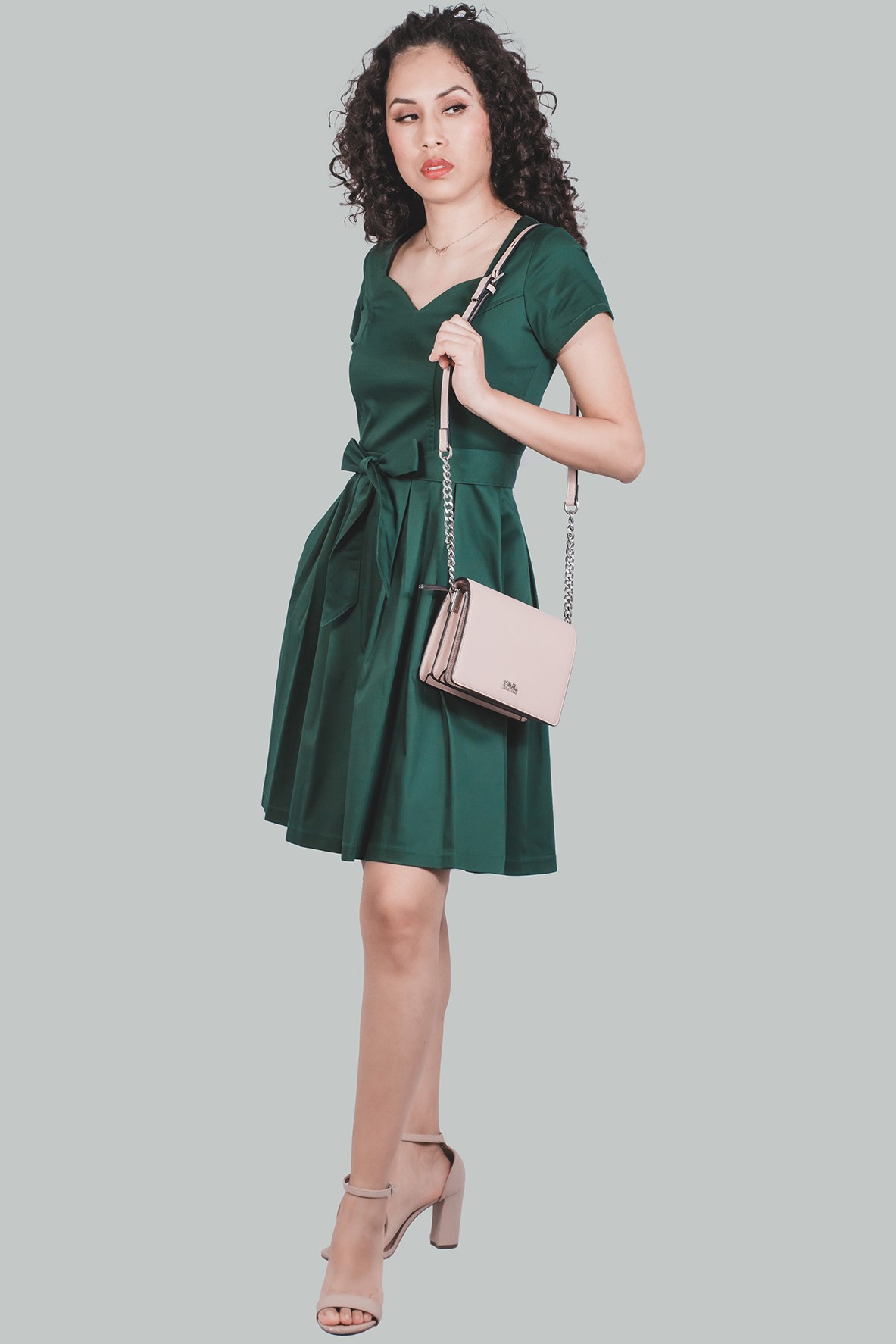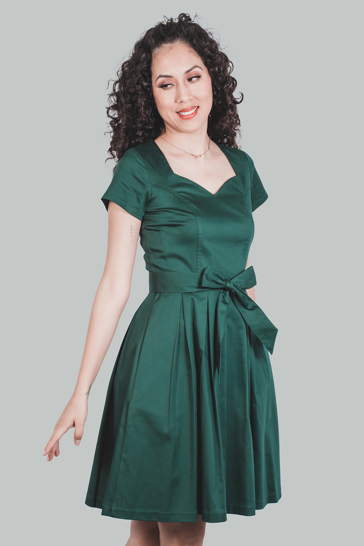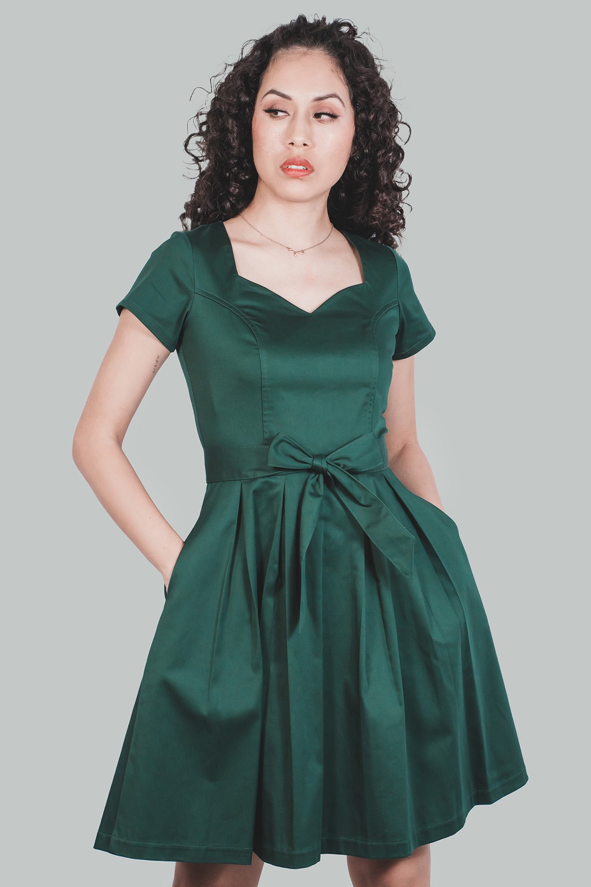 Vestido verde corte A Delia favorece a todos los tipos de cuerpo. Vestido con torso entallado, vestido acampanado formal hasta la rodilla, elaborado en tela satinado y 3 % spandex, forro completo en algodón. Elegante vestido en escote corazón en manga corta con bolsillos.